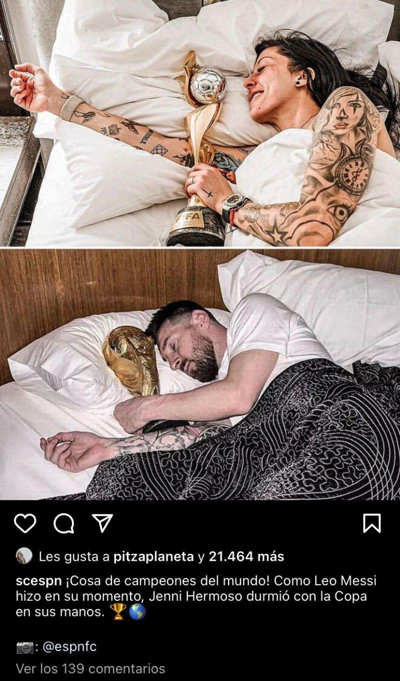 Hay algo que no podía faltar y era la réplica de la fotografía que hay de Lionel Messi con la Copa del mundo. Si, hay muchas de él pero una en particular es la que llamó la atención de Hermoso. El 10 argentino durmiendo con el trofeo en sus manos. Jenni no quiso ser menos y lo imitó al ex Barcelona y PSG. Una imágen que quedará en la retina de todos los aficionados.