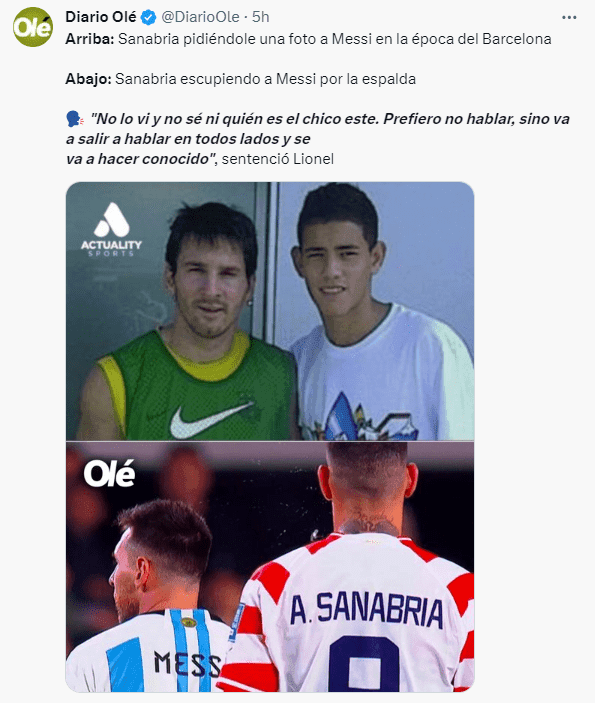 Por su parte, Sanabria habló en los micrófonos del canal argentino TyC Sports desmintiendo la situación: “Estuve viendo la imagen. Parece como que lo escupo, pero no, nada que ver. Estaba lejos. No pasó nada con Messi. Parece que lo escupo, pero nada que ver, estaba lejos. Lo desmiento totalmente”. Lo curioso es que tras el episodio se presentó una imagen viral en la que se ve como el futbolista paraguayo le pidió años atrás a Lionel Messi, mientras estaba en el FC Barcelona, la cual fue difundida horas después del episodio presentado.Recordemos que el futbolista paraguayo del Torino está valuado en 10 millones de euros, de acuerdo a la plataforma especializada en mercado y fichajes Transfermarkt.