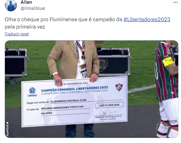Tras la obtención lo particular del caso es un valor que a muchos les ha pasado desapercibido y es el monto, en dólares que recibió el campeón de la Copa Libertadores, una suma que para muchos no es comparable ni siquiera con el gran salario de muchos futbolistas, e inclusive con la inversión realizada para este tipo de torneos. Lo cierto es que el valor es por mucho particular comparado al lado del salario anual de Lionel Messi, ya que el Fluminense recibió 25,87 millones de euros, tras el título obtenido y con el acumulado en cada una de las fases en las que avanzo hasta llegar a la gran final.