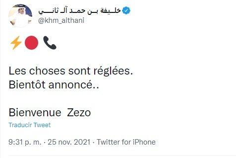 “Las cosas están arregladas. Pronto se anunciará. Bienvenido Zezo", escribió en un primer posteo en la red social del pajarito. Acto seguido, hubo un segundo posteo con la fotografía del entrenador galo, quien supo ser futbolista del Olympique de Marsella, con la leyenda "Buenas Noches". Más allá de los posteos del supuesto pariente del jeque, los rumores esta semana se vienen agitando con fuerza. Sobre todo, desde la estrepitosa caída del PSG ante el Manchester City por la UEFA Champions League.