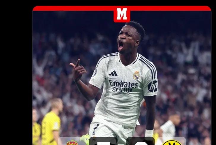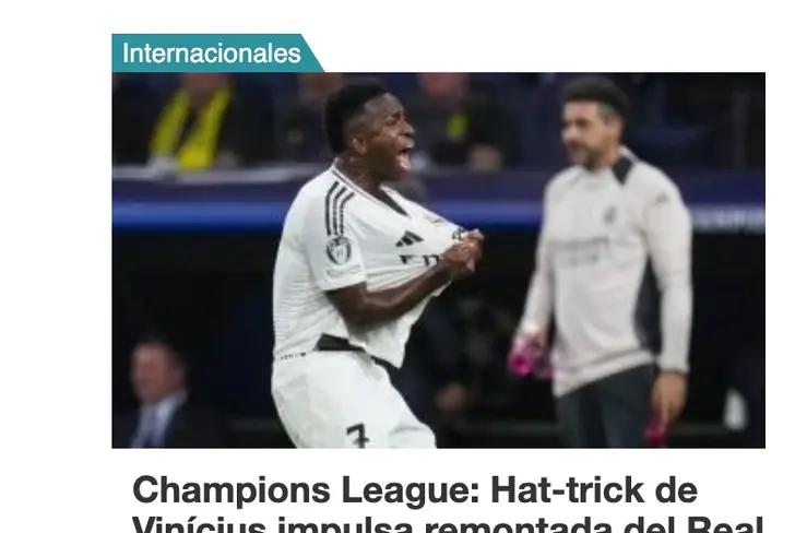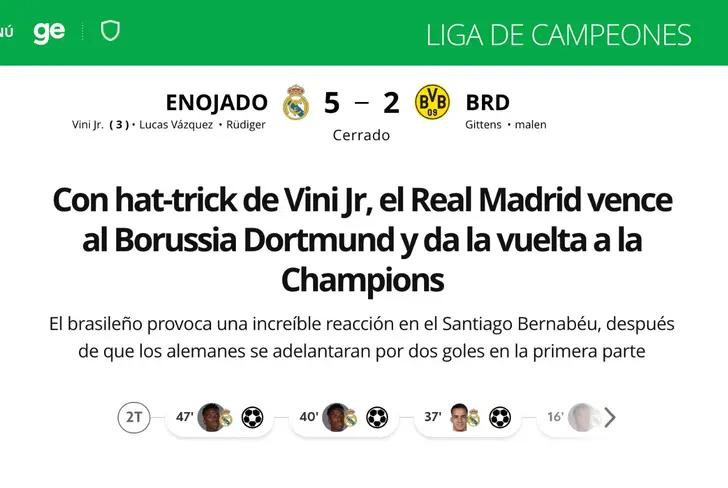 "Com hat-trick de Vini Jr, Real Madrid vence o Borussia Dortmund de virada na Champions", titula Globo Esporte, resaltando la actuación estelar del brasileño.