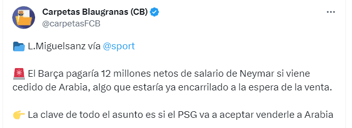 Esta sería la regla del acuerdo, una venta del PSG hacia el fútbol árabe ‘hay varios oferentes que saldrían por la puja’, la cesión al Barcelona para con este club y el pago de la no despreciable cifra de 12 millones de euros anuales por temporada para con Neymar, todo esto pensando en una cercana opción de compra del Barça para con el club árabe que lo adquiera, algo descabellado pero posible desde todo punto de vista siendo sumamente loable.