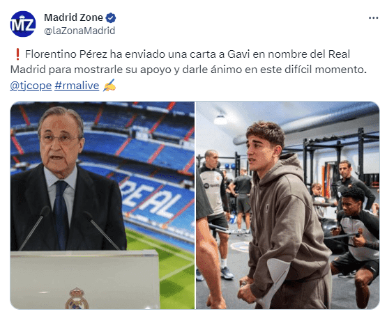 El Real Madrid, para sorpresa de muchos, se ha sorprendido en medio de la ola de solidaridad del mundo Barça para con su joven estrella, ya que se ha conocido que de parte de Florentino Pérez, el cuadro merengue ha tenido un gesto en las últimas horas para con el jugador, enviándole una carta y un sentido mensaje de apoyo y solidaridad de parte de todo el madridismo. Recordemos que uno de los actuales referentes del equipo y compañero en la selección, Joselu, ya le había dejado en las redes sociales su mención al jugador del Barça, tras la desafortunada noticia del fin de semana.
