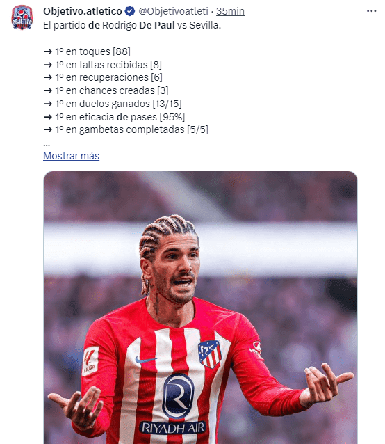 Para muchos sectores y miles de fans colchoneros en todo el mundo, la sensación tras el partido que queda es la de que el argentino fue el MVP del duelo, De Paul ha firmado una tarjeta tras los 90 minutos de 87 toques, cuatro centros, cinco regates, 12 duelos en el suelo ganados y una gran intercepción, siendo eje y caudillo en la salida necesaria del sacrificio visto en la tarde de hoy, para con Atleti que en el momento más necesario le vio aparecer para ser figura.