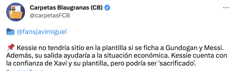 De acuerdo a información que dio Javi Miguel Club, de Diario AS: “Kessié no tendría sitio en la plantilla si se ficha a Gundogan y Messi. Además, su salida ayudaría a la situación económica. Kessié cuenta con la confianza de Xavi y su plantilla, pero podría ser 'sacrificado'”. El ex AC Milán deberá alistar maletas.