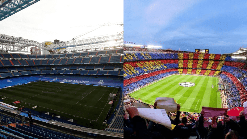 Ahora, pasamos de los estadios más pequeños a los más grandes de la Liga que son el del Real Madrid y el del Barcelona. Entre estos dos, el más grande es el Camp Nou con una capacidad total de 99,354 y con reformas estipuladas para 2024 llegaría a un aforo de 105.000 personas. Asimismo, actualmente es el estadio más grande de Europa. Por su parte, el Santiago Bernabéu puede albergar en este momento a 81,044 y cuando las obras actuales concluyen podría agregar a 3000 aficionados más.
