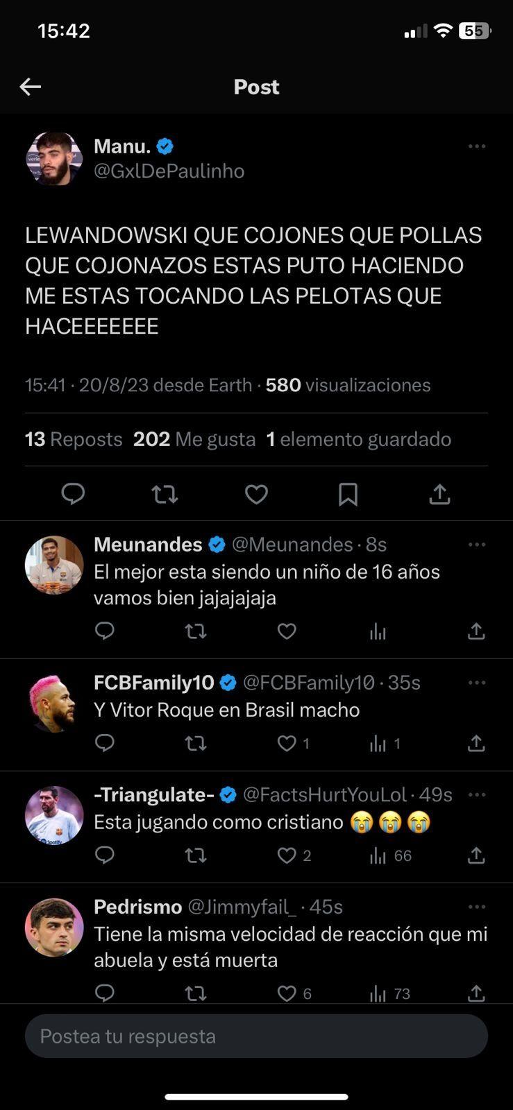 En redes sociales, los hinchas también están mostrando su disgusto con lo que están viendo en el campo de juego. El primer apuntado es Robert Lewandowski. Su participación es nula, no pivotea como lo hacía antes y cualquier empujon que le hacen, pide falta. Sin su delantero de referencia, el único que intenta de hacer algo es Lamine Yamal.
