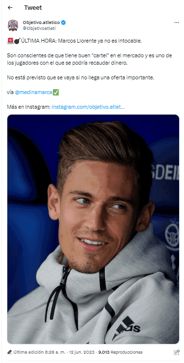 De acuerdo a la información que aporta David Medina de Marca, Marcos Llorente dejó de ser un jugador intocable entre los preferidos de Diego Simeone. Para los dirigentes es uno de los jugadores que pueden salir como posible venta debido al buen rendimiento que ha tenido y lo consideran uno de los codiciados del mercado.