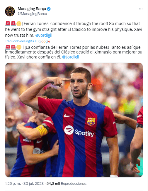 Ferrán Torres está decidido a convencer a Xavi Hernández de que lo deje en FC Barcelona y le dé minuto en la temporada. Lejos de tomarse descanso tras la goleada, el delantero español arrancó la jornada del domingo yendo a entrenarse por su cuenta en el gimnasio para seguir mejorando su físico. Sí, todo suma para ganarse el amor del entrenador.