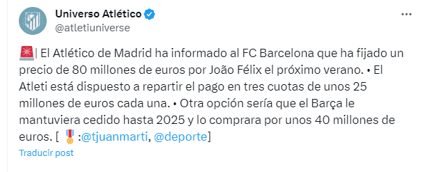 Ante ello, y según ha trascendido desde diversas fuentes, el Atlético de Madrid estaría dispuesto a negociar una salida que le genere algo de ganancia, ante la alta inversión que realizaron por el fichaje de Félix, “el más costoso de toda su historia con 127,2 millones de euros” desembolsados al Benfica, por ello y de acuerdo a lo que menciona el periodista Toni Juanmarti el valor fijado por el Atleti al Barça sería de 80 millones de euros para su total compra, y le pretende ofrecer dos chances de pago, ante la mala situación económica que atraviesa el actual campeón de LaLiga. ¿Se dará?