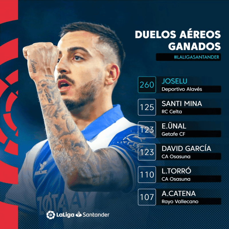 Joselu Mato es, con diferencia, el jugador que más duelos ganados suma en toda LaLiga Santander. El ariete ha ganado nada más y nada menos que 260, 135 más que el segundo en la lista de esta particular clasificación, el delantero del Celta, Santi Mina. El equipo que se haga con Joselu ganará en fortaleza en el juego aéreo.