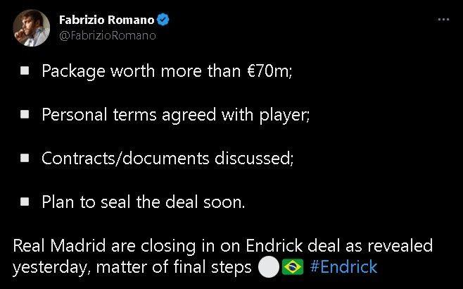 Endrick jugará en el Real Madrid. La gran joya de 16 años del Palmeiras llegó a un acuerdo con el Merengue para vestirse de blanco y pronto se terminarán de resolver los últimos flecos para cerrar el trato. Así lo contó en las últimas horas Fabrizio Romano, el famoso periodista italiano que es considerado el número 1 en materia de mercado de pases.