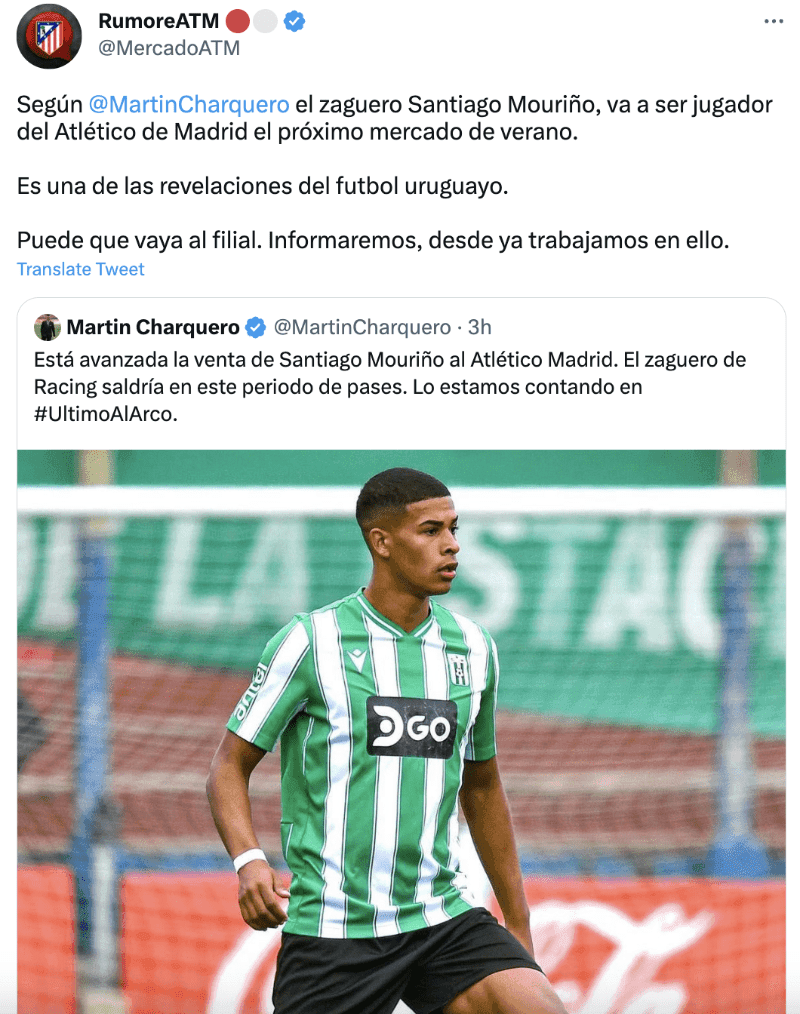 De acuerdo a información de Martin Charquero, “el zaguero Santiago Mouriño, va a ser jugador del Atlético de Madrid el próximo mercado de verano. Es una de las revelaciones del futbol uruguayo”. La prensa especializada charrúa lo ha comparado con Ronald Araujo en sus inicios, porque tiene un juego similar.