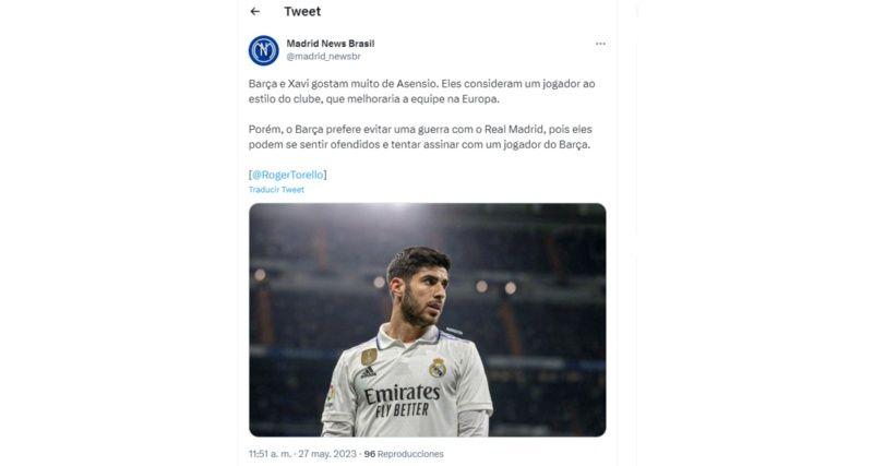 En FC Barcelona gusta y mucho Marcos Asensio. Aunque parezca ilógico, el delantero de Real Madrid es muy bien visto por Xavi Hernández y hasta se rumoreó un posible interés del Culé. El cuerpo técnico considera que es del estilo del club y que podía mejorar al equipo para competir en Europa, tal como informa Roger Torello.
