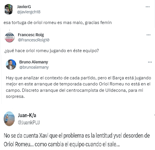 Uno de los seguidores cuestionó la presencia de Oriol Romeu en el equipo, planteando la interrogante de por qué está jugando en el Barcelona. Otros lo describieron de manera contundente como un jugador de bajo rendimiento, utilizando metáforas como "esa tortuga de Oriol Romeu es más malo". Los aficionados mostraron su gratitud hacia otro jugador, Fermín López, por su contribución en el empate frente a Mallorca.