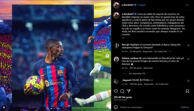 Ya se hizo realidad y el culebrón terminó. Ousmane Dembélé ya no es más jugador del FC Barcelona y es nuevo player del Paris Saint Germain. Por un total de 50.4 millones de euros, su pase quedó resuelto. Tras confirmarse su marcha al club parisino, el delantero se despidió del público blaugrana a través de su cuenta de instagram.