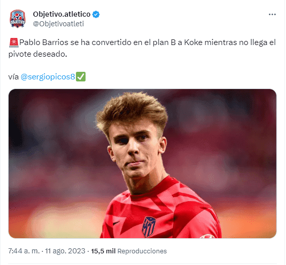 De acuerdo a la información de Sergio Pico de diario AS, Diego Simeone eligió a Pablo Barrios como el jugador que ocupará el lugar de relevo de Koke en caso de que el equipo necesite recambio en esa posición. Al entrenador lo convenció su nivel y sus ganas, motivos que lo llevaron a ganarse un puesto como alternativas.