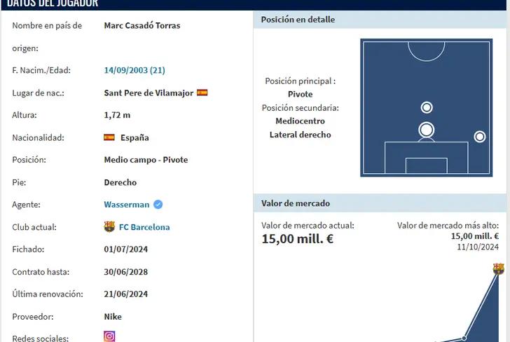 Esta evolución no ha pasado desapercibida para los principales portales especializados en el mercado de fichajes. Transfermarkt, una de las referencias más consultadas en este ámbito, ha actualizado constantemente el valor de mercado de Casadó, reflejando así su creciente importancia en el equipo culé.