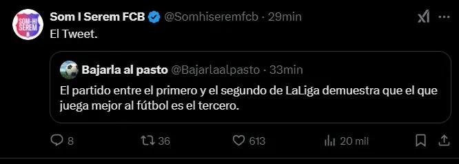 Las redes sociales se han llenado de mensajes de celebración por parte de los hinchas del Barcelona. Los culés han utilizado hashtags como #HalaMadridyNadaMás, #ElClasicoEsNuestro y #LigaParaElBarça para expresar su alegría y burlarse de sus rivales.