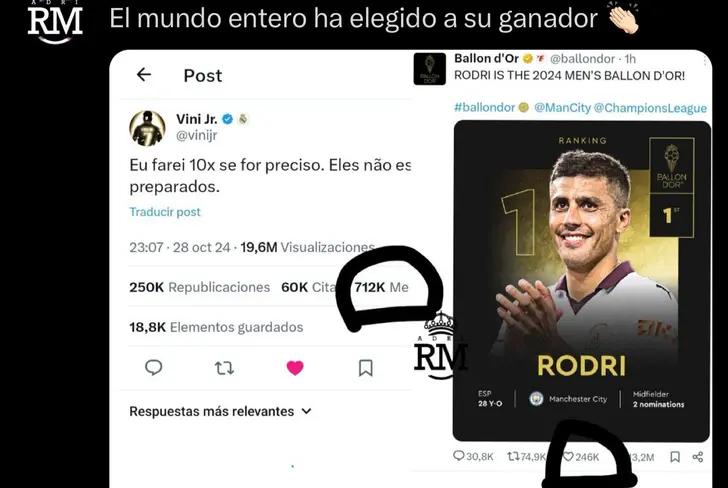 Las cifras no mienten. Mientras que el post de Vinícius Jr. acumuló más de 712 mil reacciones, la publicación de Rodri como ganador del Balón de Oro apenas superó las 246 mil. Esta diferencia abismal demuestra el gran impacto que generó el mensaje del brasileño y el cariño que siente la afición madridista hacia él.