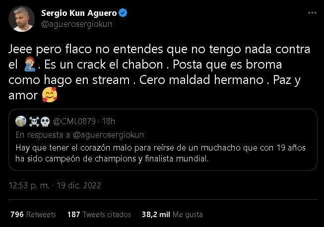 Un usuario re recriminó en Twitter el haber insultado a Eduardo Camavinga, a lo que Agüero respondió: "Jeee pero flaco no entendes que no tengo nada contra el. Es un crack el chabón . Posta que es broma como hago en stream . Cero maldad hermano. Paz y amor". Así, quedaron zanjados los conflictos que envolvieron al ex Atlético de Madrid y Barcelona, entre otros.