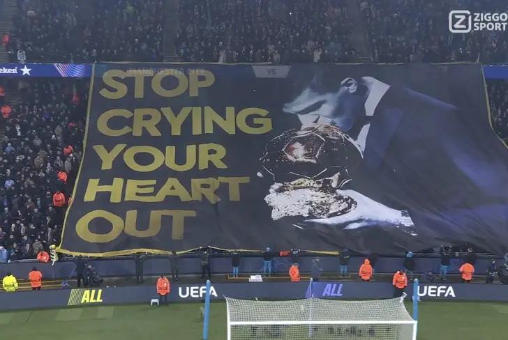 Todo comenzó cuando los aficionados del Manchester City desplegaron un tifo en honor a su capitán, Rodri, quien recientemente había ganado el Balón de Oro. Hasta ahí, todo normal. Sin embargo, lo que llamó la atención fue la frase que acompañaba la imagen del jugador: "Stop crying your heart out", que en español se traduce como "Deja de llorar desconsoladamente".