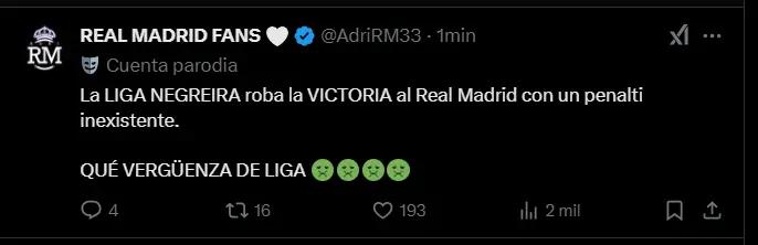 En las redes sociales se ha desatado una ola de críticas hacia el arbitraje, utilizando el término "Liga Negreira" para referirse a una supuesta conspiración en contra del Real Madrid. Esta acusación no es nueva y ha surgido en diversas ocasiones a lo largo de la historia del club blanco.