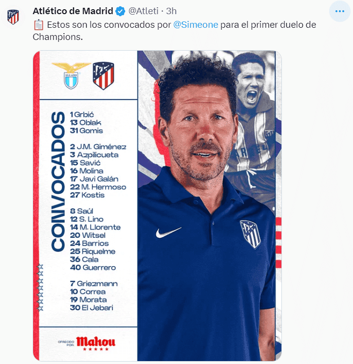 El primer compromiso del Atleti será en el Estadio Olímpico de la ciudad de Roma donde los dirigidos por el Cholo Simeone, arrancaran la competencia en el Grupo E de la UEFA Champions League, ante la Lazio desde las 21:00 con el arbitraje del esloveno Slavko Vincic.