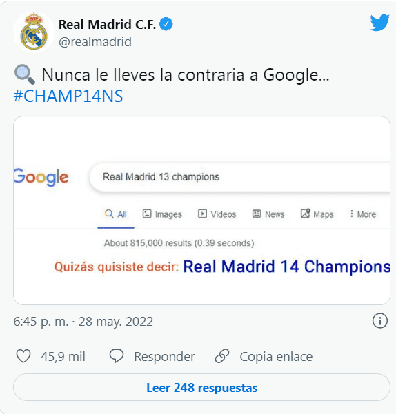 El Real Madrid Club de Fútbol consiguió nuevamente alzarce con el trofeo de la UEFA Champions League, y volvió a ser el equipo más dominante de todo el mundo. A pesar de no ser el favorito, superó todos los prónosticos y aprovecho su mistica copera para lograr un nuevo hito internacional.