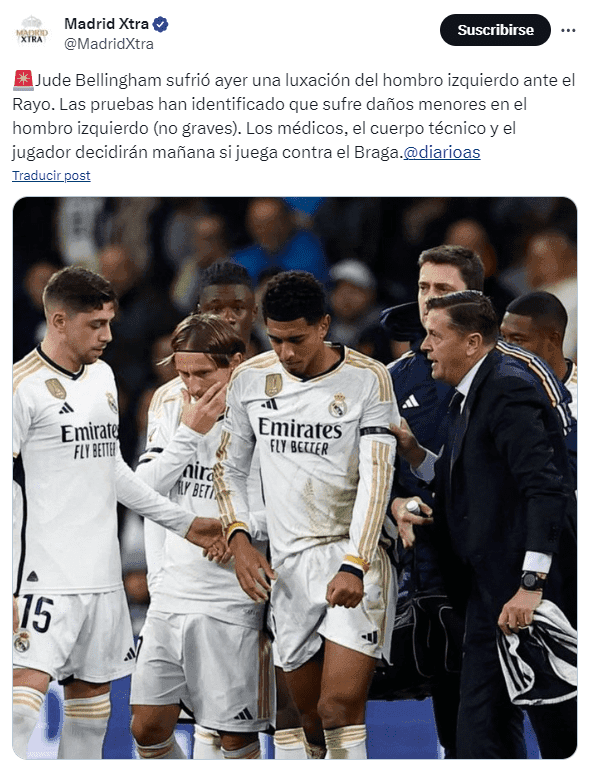 El mismo entrenador merengue tras el compromiso hablo del estado de salud de Jude Bellingham, referenciando la atención que se tendría para con el jugador en un momento clave y en el intervalo que conlleva el duelo de LaLiga y la visita del SC Braga por la UEFA Champions League: “Mañana harán pruebas a Bellingham. Espero que esté el miércoles con nosotros, pero parece que no es mucho. Esperemos que no”.