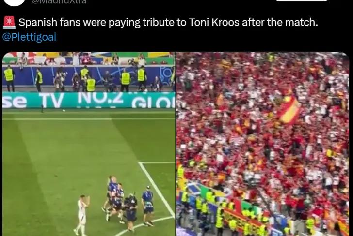 De acuerdo a información de Florian Plettenberg, reportero de Sky Sports: "La afición española rindió homenaje a Toni Kroos tras el partido". El mediocentro alemán contestó con aplausos a los elogios que recibió por parte de la general donde fueron ubicados los hinchas de la Selección de España.