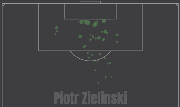 Otro jugador para marcar desde afuera del área y marcar para el Napoli es Zielinski que tiene probabilidades fuera del área inclusive.