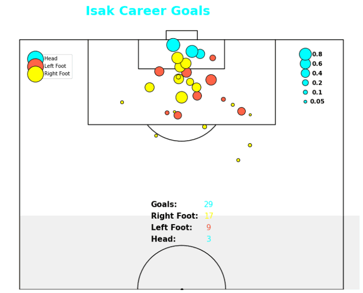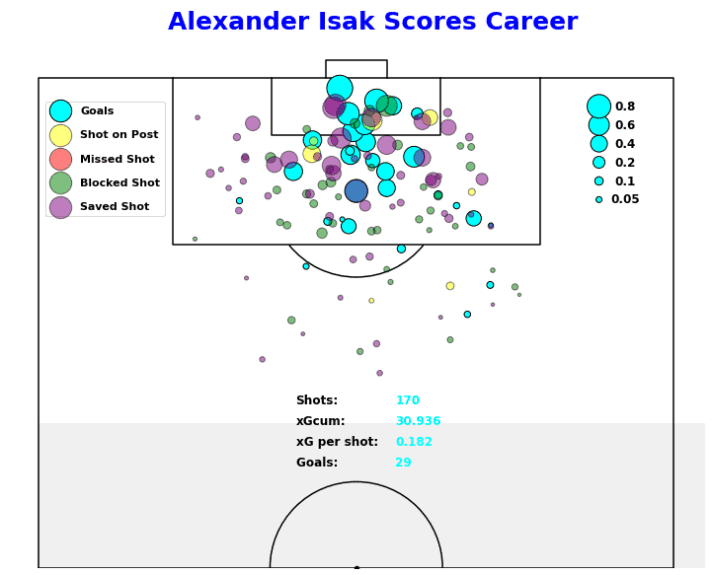 Como podemos observar, Alexander Isak es la carta de presentación para que Real Sociedad clasifique a la próxima instancia de la Eurocopa. Para eso, el equipo español tiene que entregarle la pelota al delantero estrella en el área chica para que las probabilidades aumenten en un 80%.