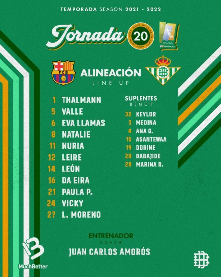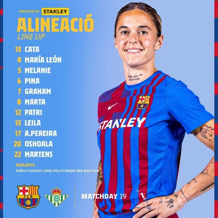 Giráldez planteó un 4-3-3 con Cata, María Leon, Melanie, Pina, Graham, Marta, Patri, Lila, A. Pereira, Oshoala, Martens. Por su lado el Betis formó 4-2-3-2 con Thalmann, Valle, Eva Llamas, Jacobs, Nuria, Leire, León, Da Eira, Paula P., Vicky, Laura M.