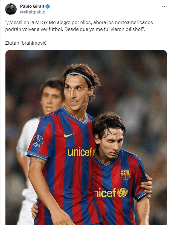 De acuerdo a su particular estilo, Ibrahimovic contestó de la siguiente manera “¿Sobre Messi en la MLS? Me alegro por ellos porque ahora volverán a ver fútbol. Desde que yo me fui solamente miraban béisbol”. Lo cual despertó las risas y aplausos de los asistentes al evento. Recordemos que ambos compartieron paso por el FC Barcelona, cuando en la temporada 2009-2010 hasta la 2010-2011, el jugador llegó a las filas del cuadro blaugrana, allí conquistó 2 supercopas de España, una liga, un Mundial de Clubes y una Supercopa de Europa, convirtiendo 24 goles en 51 compromisos con la camiseta del Barça.