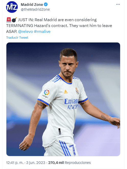 El tema importante que tiene que ver con Eden Hazard es el contractual. El delantero de 32 años tiene contrato vigente con Real Madrid y el mismo vence recién el 30 de junio del 2024. Ante este panorama, la única manera de que pueda salir es que el club y el jugador acuerden con otra entidad una transferencia.