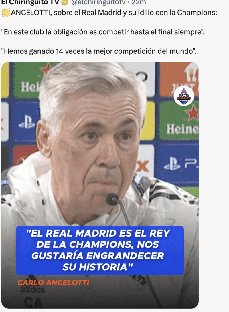 "En este club la obligación es competir hasta el final siempre. Hemos ganado 14 veces la mejor competición del mundo… El Real Madrid es el Rey de la Champions (League), nos gustaría engrandecer su historia", mencionó Carlo Ancelotti en rueda de prensa, en la previa del cotejo de Champions ante Chelsea.