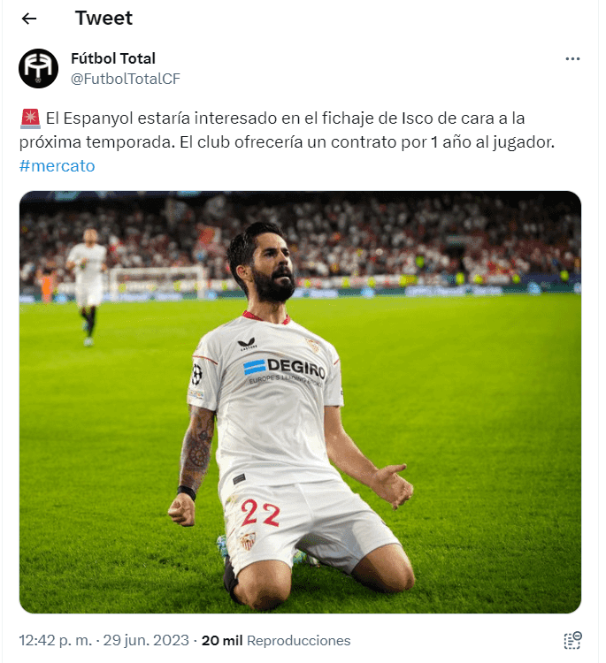 Sevilla apareció al rescate pero duró apenas un puñado de meses, jugando solo 19 partidos y anotando un tanto, y ahora, Isco Alarcón es una de las posibilidades de fichaje de Espanyol de Barcelona, recientemente descendido a la Segunda División, al que llegaría como agente libre tras quedarse con el pase en su poder.