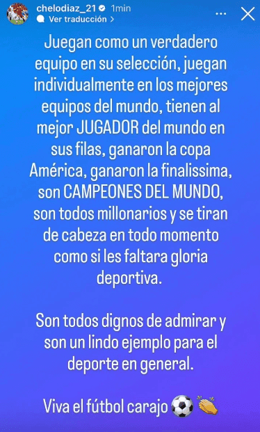 “Juegan como un verdadero equipo en su selección, juegan individualmente en los mejores equipos del mundo, tienen al mejor jugador del mundo en sus filas, ganaron la Copa América, ganaron la Finalissima, son campeones del mundo, son todos millonarios y se tiran de cabeza en todo momento como si les faltara gloria deportiva. Son dignos de admirar y son un digno ejemplo para el deporte en general. Viva el fútbol, carajo”, fueron las emotivas palabras del chileno Marcelo Díaz a Lionel Messi y la Argentina.