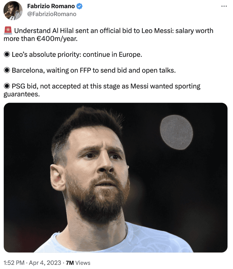Lionel Messi es uno de los jugadores que no la pasa bien en el PSG y es por ello que su futuro no está seguro en el club, aunque FC Barcelona le abrió las puertas y tienen la intención de volverlo a tener entre sus filas, ha aparecido una propuesta que sobrepasó cualquier expectativa del Al Hilal, un sueldo de 400 millones de euros por temporada.