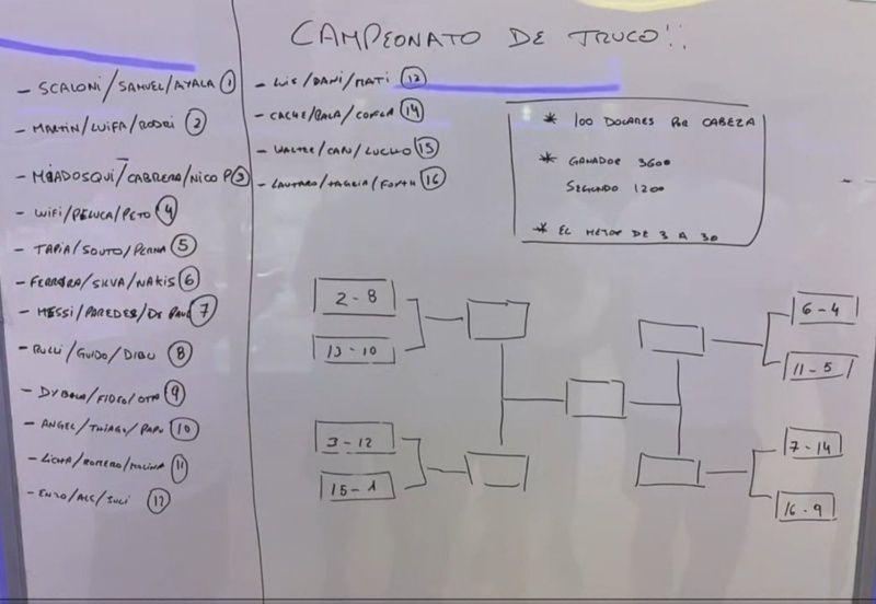 El formato son parejas de a tres y las reglas son claras: 100 dólares por cabeza y pasa de ronda el equipo que gane al mejor de tres partidas. Lo curioso es que no solamente participarán los futbolistas, sino que también lo harán integrantes del cuerpo técnico, utileros y demás miembros del staff argentino. Los únicos jugadores que no participan del torneo son Marcos Acuña y Germán Pezzella.