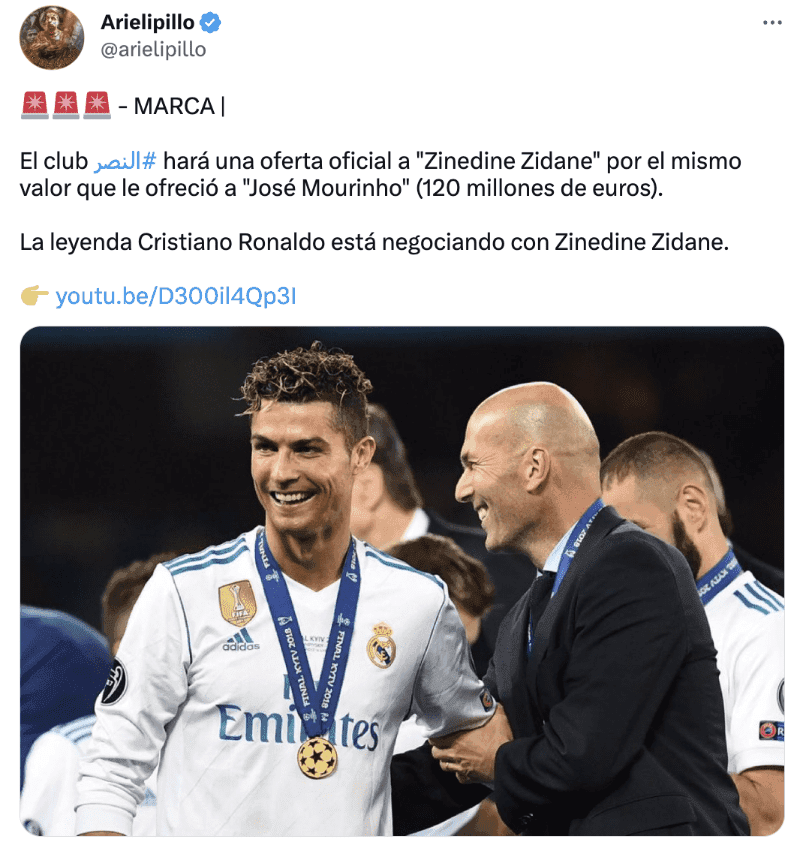 Y es que mientras Cristiano Ronaldo gana 200 millones por temporada, a Zinedine Zidane también le ofrecieron un salario millonario pero que está lejos de lo que percibe el jugador portugués. El director técnico francés todavía no ha dado una respuesta pero Al-Nassr ha empezado a mover fichas para convencerlo de llegar a Arabia.