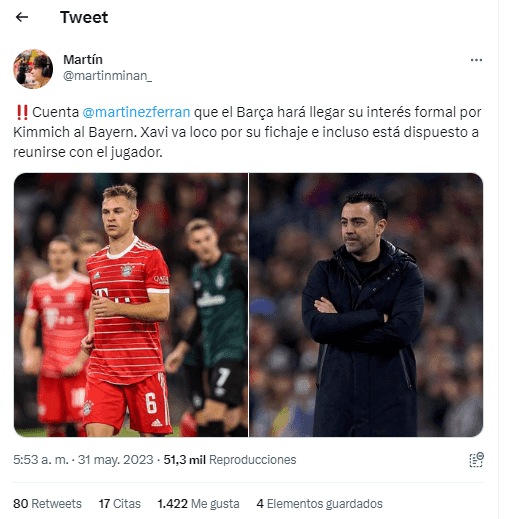 Declaración al margen para Xavi Hernández, Joshua Kimmich es un jugador muy importante por la experiencia que tiene por la jerarquía y porque le podría dar una variante con un salto de calidad a la zona de la mitad del campo del equipo. Su salida del equipo alemán no será nada fácil más con el Fair Play Financiero.
