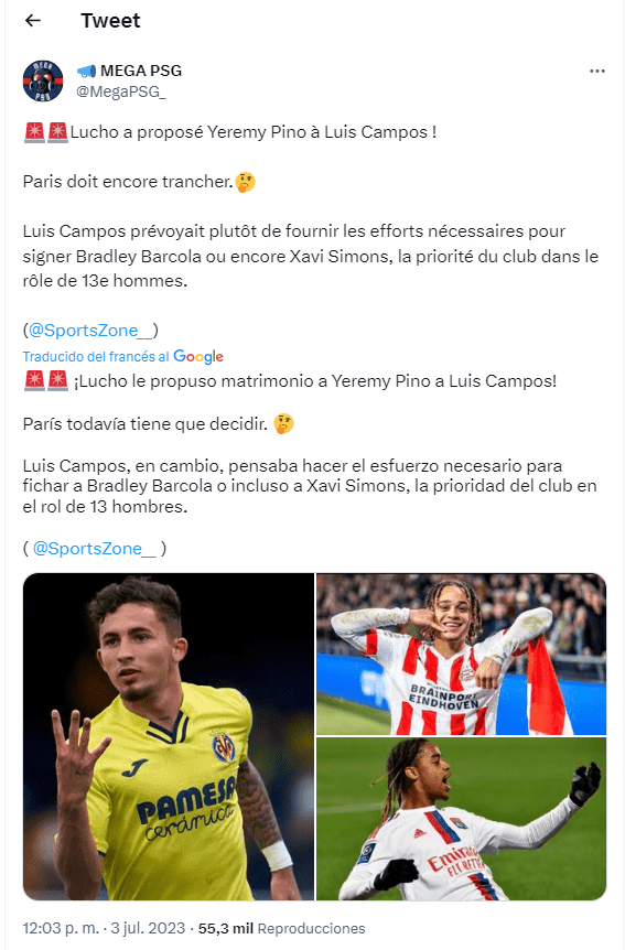 Más allá del interés por Xavi Simons, en PSG tienen una alternativa en caso de que el joven neerlandés no llegue como refuerzo. Luis Enrique pidió por Yeremy Pino, delantero de 20 años que cumplió con una destacada actuación con la camiseta de Villarreal FC en La Liga. Para conseguirlo, el club francés también deberá desembolsar 40 millones de euros, según su valor de mercado en Transfermarkt.