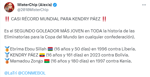 Kendry Páez, una de las nuevas joyas del fútbol sudamericano, y quien firmó con el Chelsea FC por un valor de 22 millones a partir de la temporada 2025-2026, cuando el futbolista cumpla la mayoría de edad, se convirtió en el anotador más joven en la historia de las Eliminatorias Sudamericanas, con el gol que transitoriamente le dio el 1 a 1 parcial a la Selección de Ecuador ante Bolivia en la altura paceña.