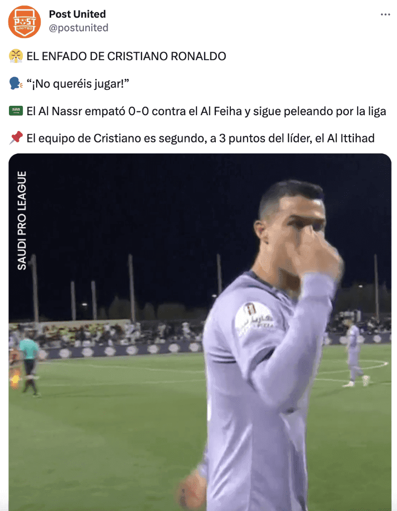 Y es que en el último partido del Al-Nassr, ante Al Feiha, los rivales decidieron quemar tiempo esperando guardar el empate sin goles contra el equipo de Cristiano Ronaldo, lo que lo enfureció puesto que no le gustó su actitud. El portugués fue captado por las cámaras muy molesto y diciendo “¡No queréis jugar!”.