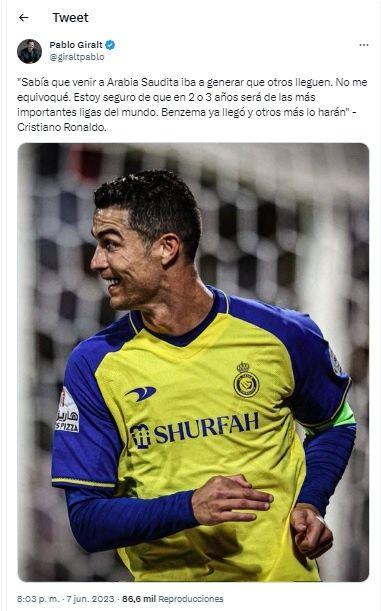 Tal como refleja el periodista Pablo Giralt, Cristiano Ronaldo confirmo que no se equivoco en elegir como destino Arabia Saudita, ya que según su óptica, en dos o tres años será una de las ligas más competitivas del mundo. De esta manera, indirectamente despotrica contra la decisión de Lionel Messi de ir a una desvalorada MLS.
