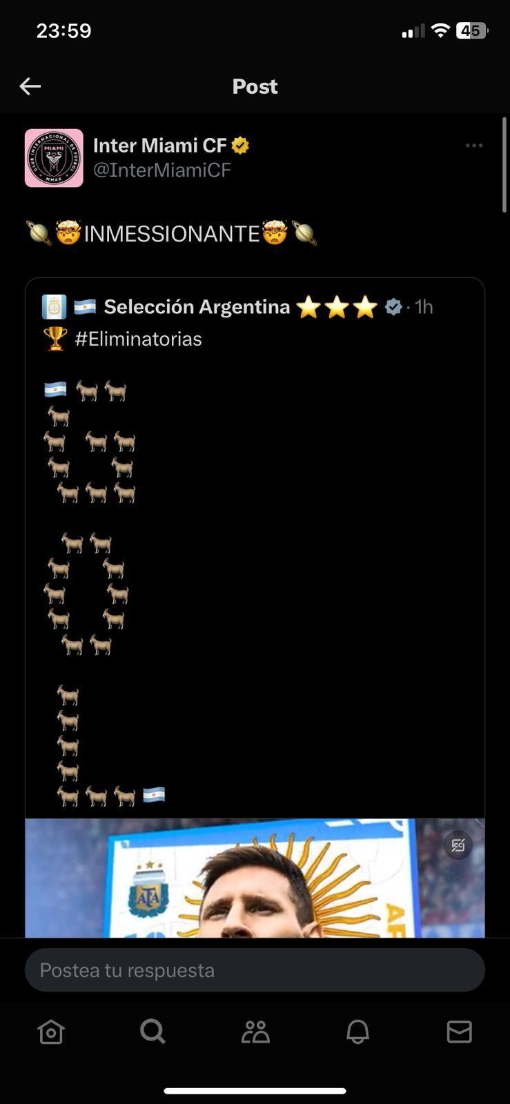 Inter Miami, el club que preside David Beckham, no dudó en reconocer a su nueva figura y le mandó un mensaje en las redes sociales oficiales del club. La publicación tenía la palabra Inmessionante y el gol formado con cabras, jugando con el termino GOAT, con el que se lo relaciona bastante seguido al atacante argentino.