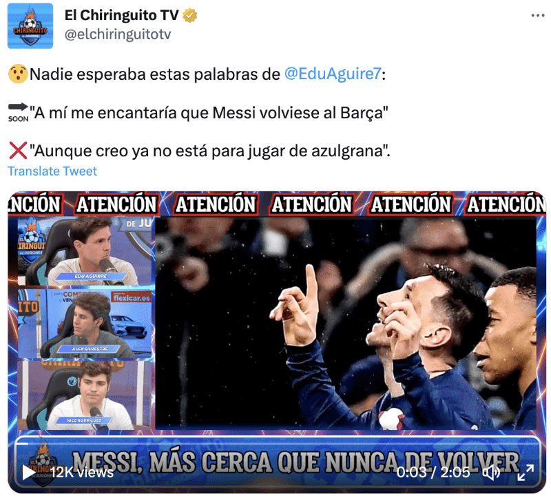Lionel Messi está cada vez más cerca del FC Barcelona y Joan Laporta cada vez está más cerca de cumplirlo. El español Eduardo Aguirre, de El Chiringuito TV, opinó al respecto y consideró que es una llegaba importante, no solo para el equipo Culé sino para el torneo español. "A mí me encantaría que Messi volviese al Barça", dijo.