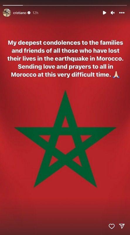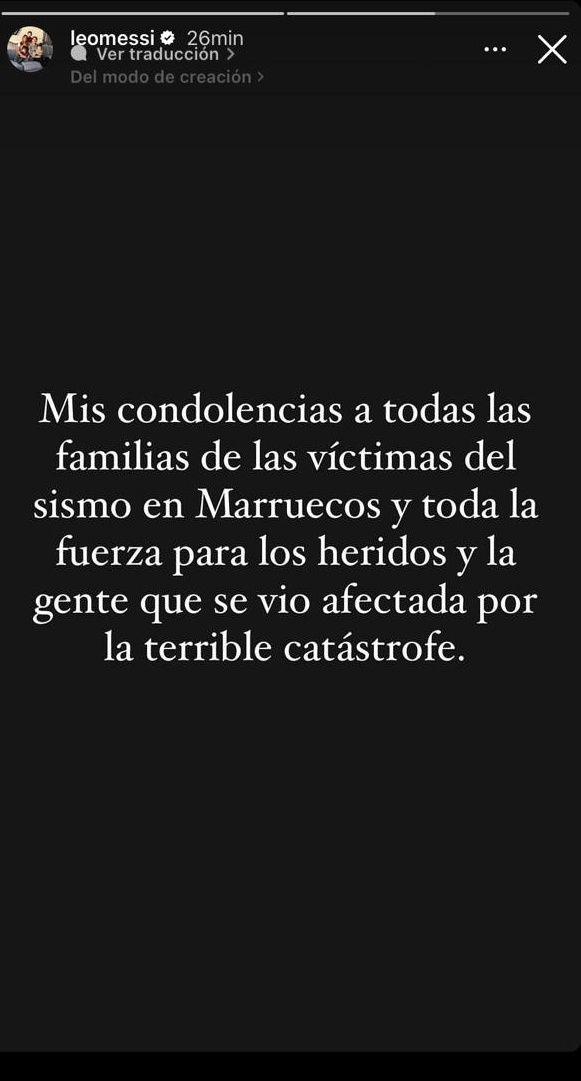 Lionel Messi también compartió sus condolencias, expresando su apoyo a las familias de las víctimas y enviando fuerza a los heridos."Mis condolencias a todas las familias de las Víctimas del sismo en Marruecs y toda la fuerza para los heridos y la gente que se vio afectada por la terrible catástrofe", posteó el diez de la Selección Argentina.